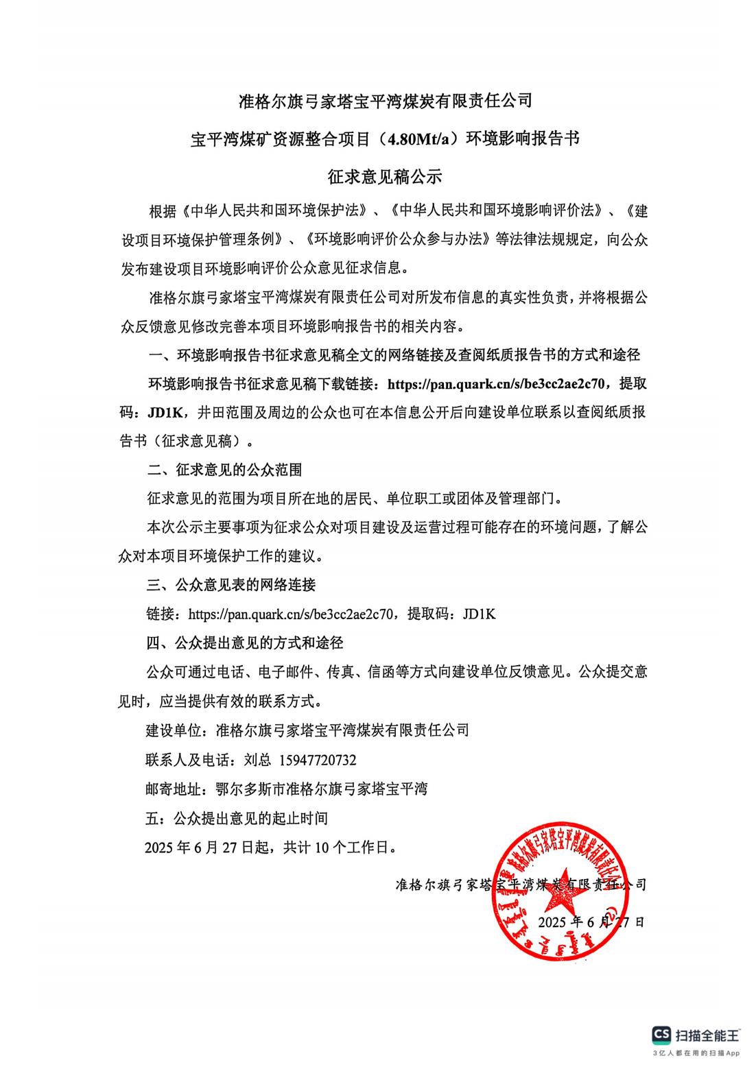 寶平灣煤礦環(huán)評征求意見稿
